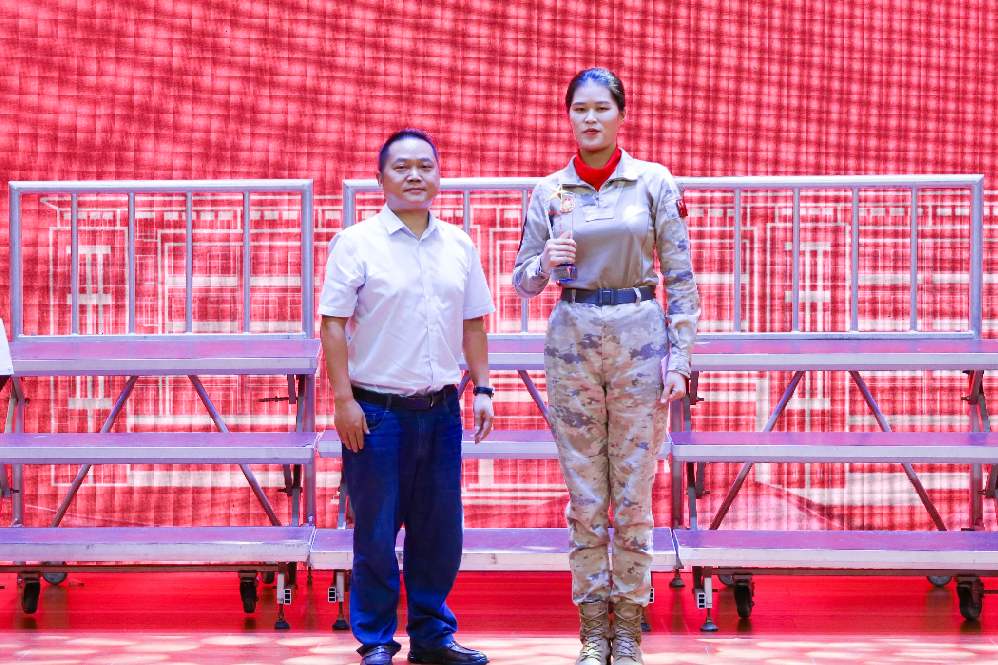 tyc41183太阳成集团党委书记徐华胜为老生代表93阅兵参与者、商务英语2023级1班谭宁颁发“tyc41183太阳成集团励志担当楷模”荣誉称号,以此表彰其优秀表现,并激励全体学生见贤思齐。谭宁用“坚持”“团结”“担当”三个关键词分享了她五年的军旅生涯和50余场国家级仪仗司礼任务,鼓励同学们将对祖国的热爱,化作日常学习生活中的不懈动力。