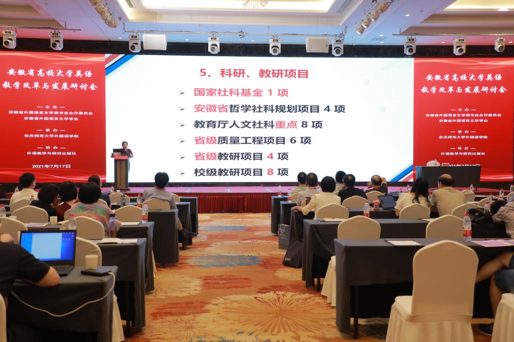 张文在大会上还展示了我校大学英语教研室通过推行教学改革,在教学和科研上取得的丰硕成果:大学英语教研室教授2人,副教授6人,博士1人,博士在读2人。荣获安徽省省级示范教研室、省级大学英语课程思政教学团队;张玮获国家社科基金1项,张文获安徽省哲学社科规划项目2项,瞿宁霞、胡靓分别获安徽省高校优秀青年人才支持计划项目、高校优秀青年骨干人才国内访学研修项目,教育厅人文社科重点项目8项,核心期刊(CSSCI)发表论文11篇;获省级质量工程项目7项,国家级和省级规划教材4部,省级教学成果奖2项,省级大规模在线课程MOOC 1门,省级大学英语课程思政示范课程2项,全国高校外语课程思政教学比赛团队二等奖,外研社“教学之星”大赛获一等奖2项,“外教社杯”全国外语教学大赛一等奖、二等奖2项,全国高校教师外语微课大赛二等奖。指导学生获首届安徽省翻译大赛一等奖,指导学生获全国大学生英语竞赛特等奖8名,一等奖10名,二等奖12名。张文、瞿宁霞、朱忠焰、王巧英分别出版专著和译著4部:《现代安徽作家对十九世纪英国文学的接受》《新媒体在英语教学中的有效应用研究》《黄梅戏经典唱段》《六尺巷》。