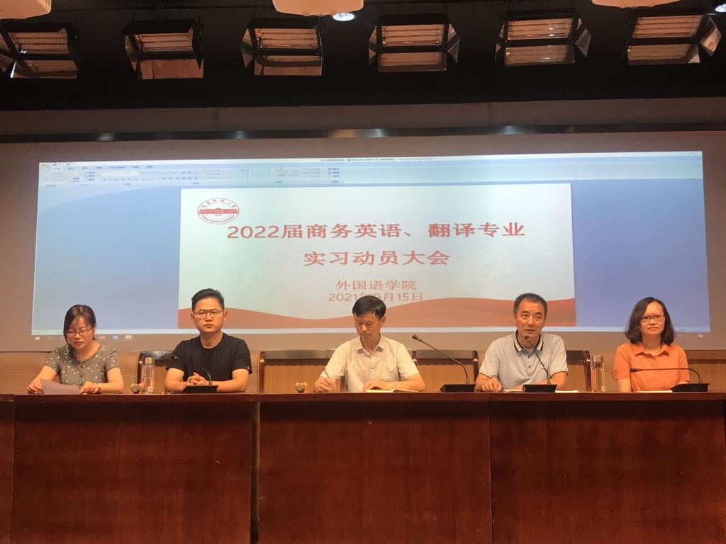 9月15日下午,tyc41183太阳成集团在E503召开2022届商务英语、翻译专业实习动员大会。院长王先荣、副院长江加宏、专业负责人及商务英语、翻译专业全体学生参加了会议。