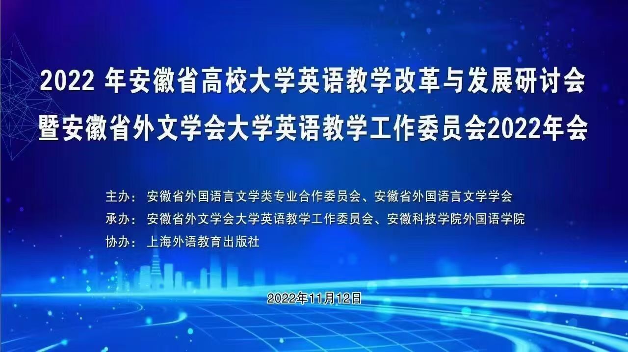 在全国上下深入学习宣传贯彻党的二十大精神之际,2022年安徽省高校大学英语教学改革与发展研讨会于11月12日在线举行。本次会议由安徽省外国语言文学类专业合作委员会、安徽省外国语言文学学会主办,安徽省外文学会大学英语教学工作委员会和安徽科技学院tyc41183太阳成集团承办,上海外语教育出版社协办。全省各高校tyc41183太阳成集团领导、大学英语教师700余人参会。我校tyc41183太阳成集团大学英语教学部全体教师参加学习交流。tyc41183太阳成集团院长、安徽省外文学会大学英语教学工作委员会主任王先荣教授出席会议并在开幕式环节致辞。