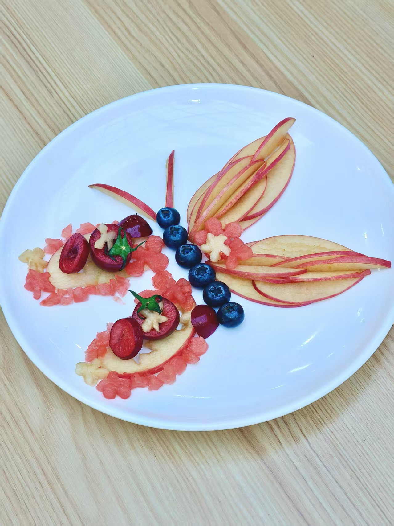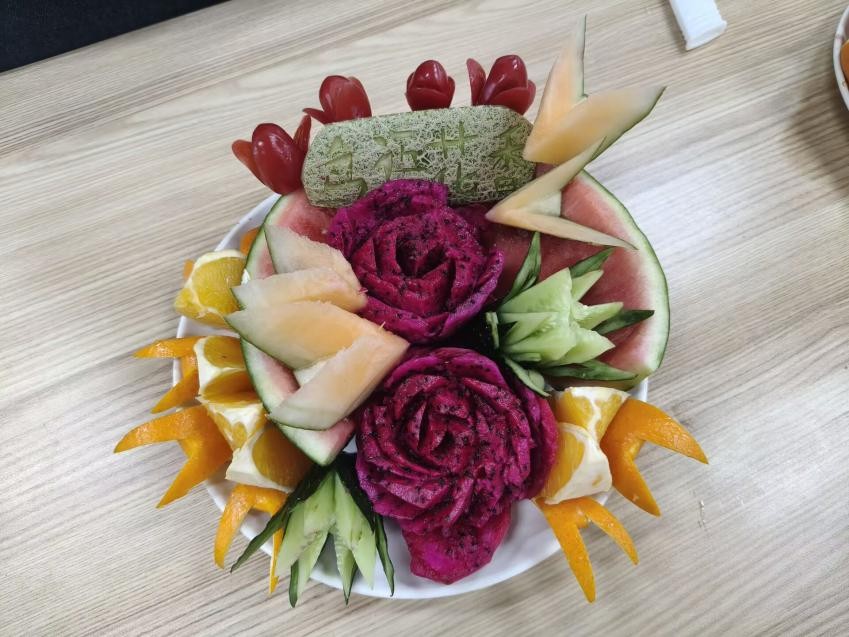 各参赛团队提交了菜肴及水果拼盘制作方案、成品照片、团队分工以及制作视频。评审小组围绕作品完整度、菜品创意、团队分工等多个维度进行综合评定。“食光小队”队伍的水果拼盘作品以黄瓜薄片卷成卷,嵌入草莓,点缀蓝莓,整体环绕成圆形,将新鲜水果与传统吉祥文化相结合,色彩清新、韵味雅致。“好耶开饭啦”队伍的水果拼盘作品《彩蝶逐春》寓意丰富,蝴蝶象征着蜕变、新生与自由,也代表着春日的生机与活力,传递出迎接美好、展翅高飞的积极祝愿。
