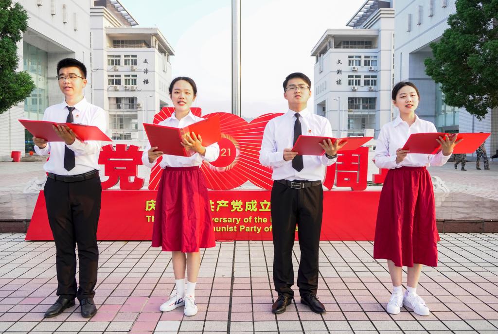 “我从小在党的熏陶下成长,对党有崇高的敬畏。”朗诵者之一的外国语言文学类专业2021(10)班的徐欣茹称,她家中的长辈多数从兵入党,是名副其实的“党兵”之家,她从小耳濡目染,了解了很多革命先辈热血挥洒的事迹。“今天在国旗下的朗诵让我真切感受到了历史的厚重、祖国的繁荣和党的伟大,这激励着我要更加努力认真。”徐欣茹坦言,作为一名新生,能在国旗下朗诵是一份荣幸更是一份感动。