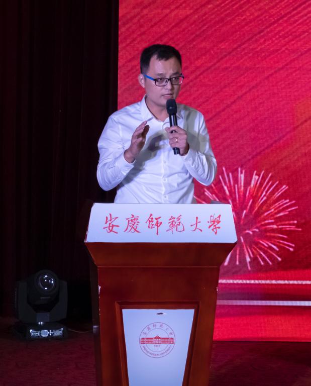“Now, as your old alumni and would-be teacher, I, for the first time, have the following ‘magic secrets’that will help you live a successful college life! ”教师代表伍健用一口流利的英语吸引了学生们的注意。他自称为“老学长”,全程用英语向新生们讲述自己的大学生涯,并给出生活学习上的建议。“To do what have to do cheerfully!”他鼓励学生们不要束缚自己,要勇敢地在大学里追求理想。