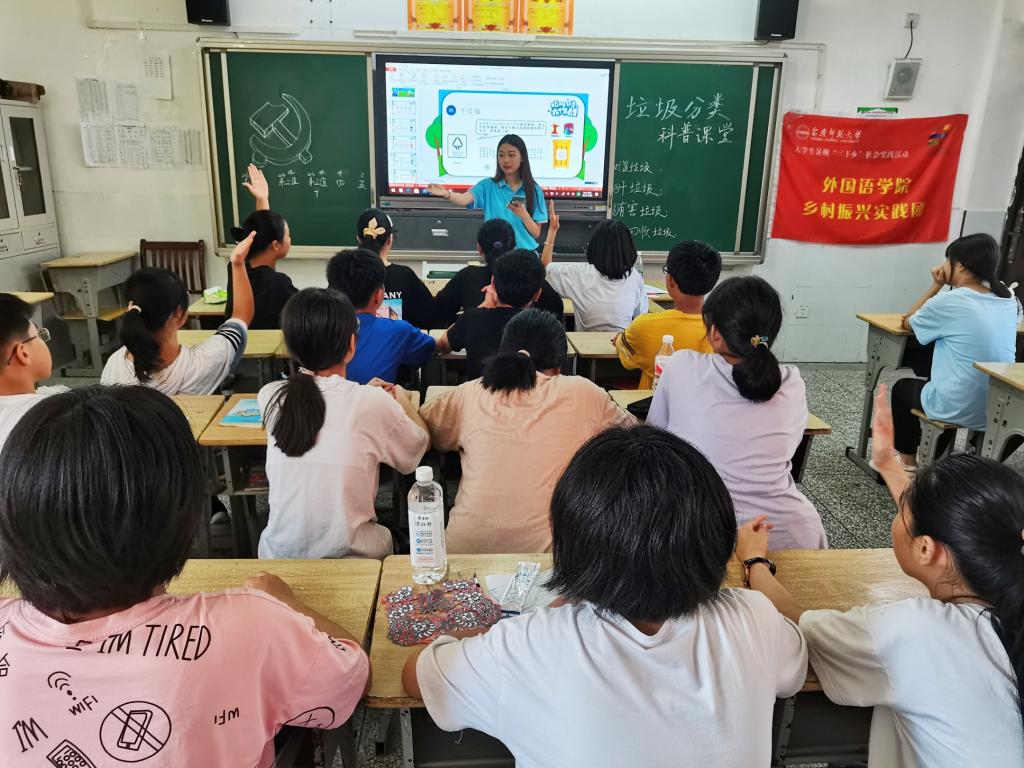 队员刘梓璇亲手绘制15张常见的垃圾种类图片,利用视频教学增加形象性,分组竞争激发学生兴趣、套圈游戏增加课程趣味性……科普课堂内容丰富、形式多样,抢答和游戏环节的设置,可谓是“抢”足了“风头”。刘梓璇表示,“我国垃圾分类已经进入常态化,但对垃圾分类的了解呈现地区化差异,我们想用接地气的方法,普及理论知识。”