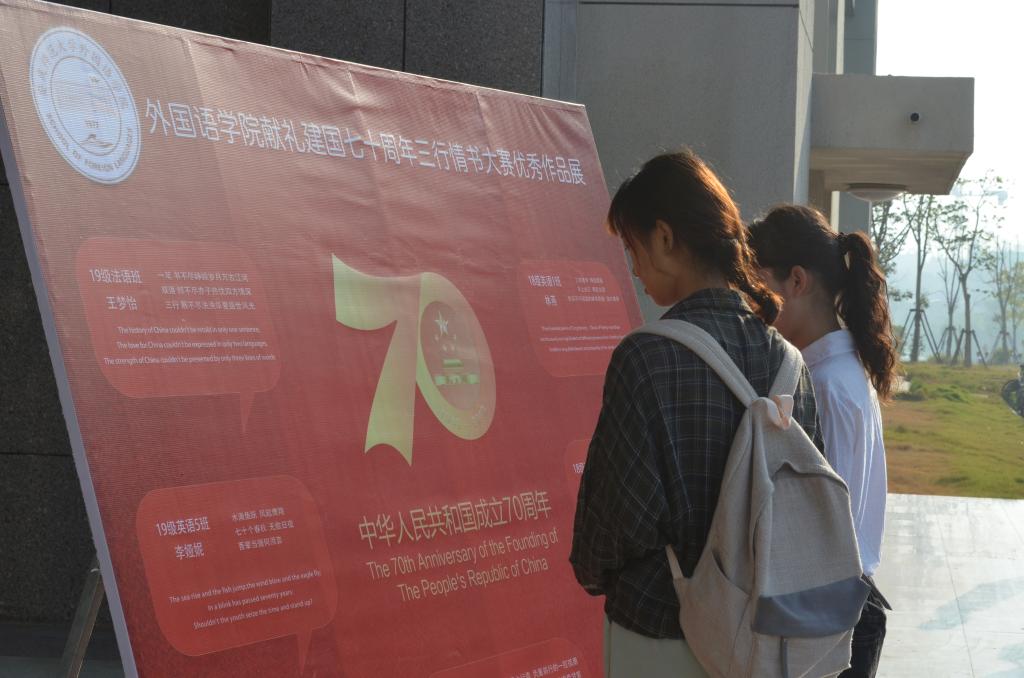 正值新中国成立七十周年,tyc41183太阳成集团面向全校学生征集汉英双语“三行情书”,以此特殊的方式号召同学们抒发心中对祖国的爱意,传播爱国主义正能量。最终,有来自各个学院的346份作品经过预选和评委打分,裁决出一等奖2名、二等奖7名、三等奖12名,其中15份优秀作品被制做成海报在tyc41183太阳成集团门口展出,吸引了大批师生驻足观看。王梦怡说出了自己参加活动的感受:“思索了很久,最终想到这三句话,虽然简单,但真切表达了我对伟大祖国的爱。”