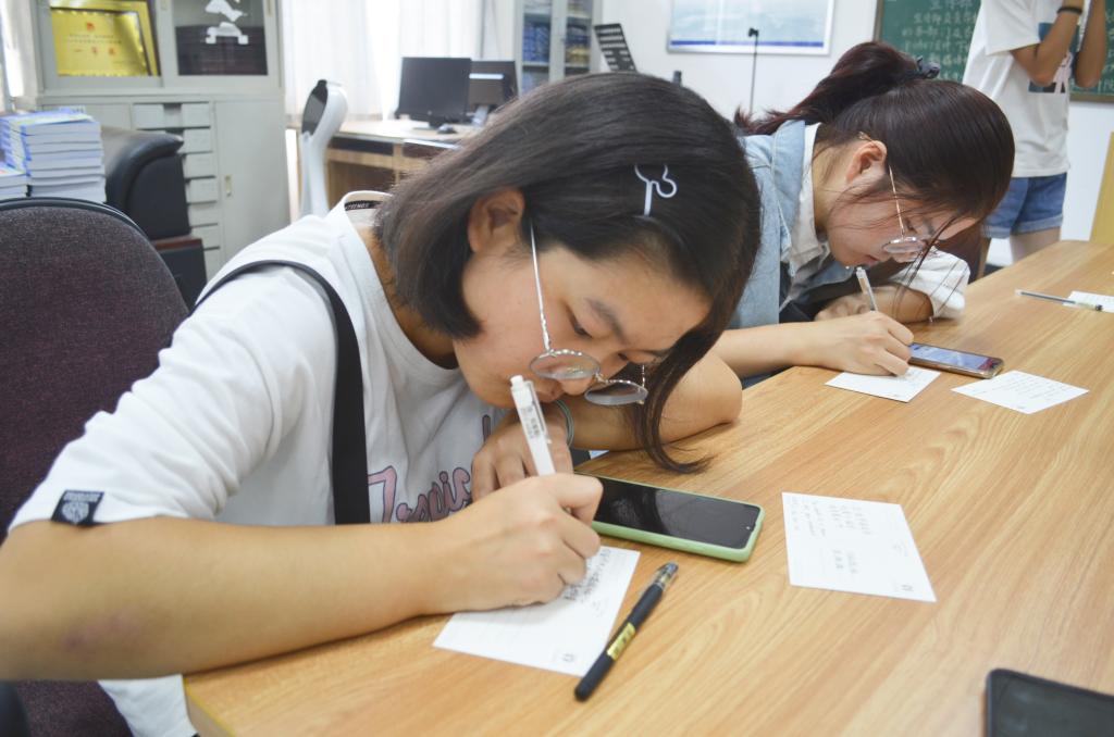 “一笔,书不尽峥嵘岁月万古江河,双语,倾不尽赤子热忱四方情深,三行 展不尽泱泱华夏盛世风光。”tyc41183太阳成集团一楼大厅里,来自2019级法语专业的王梦怡正趴在桌上书写这几句情话,在她周围坐着的同学同样奋笔疾书,书写心中的柔情。
