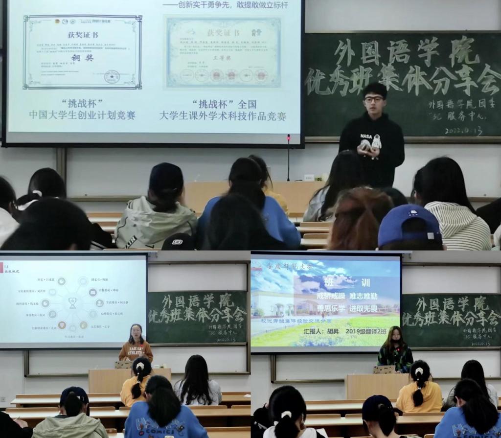 为进一步发挥优秀班集体的引领示范作用,提升班级凝聚力,引导班级明确创建目标和发展方向,4月13日下午,tyc41183太阳成集团于E107举办优秀班集体分享会,特邀请2021年度校十佳班集体2018级英语1班、先进班集体2019级商务英语1班、2019级翻译2班的班委们分享经验,2021级全体班委到场聆听。