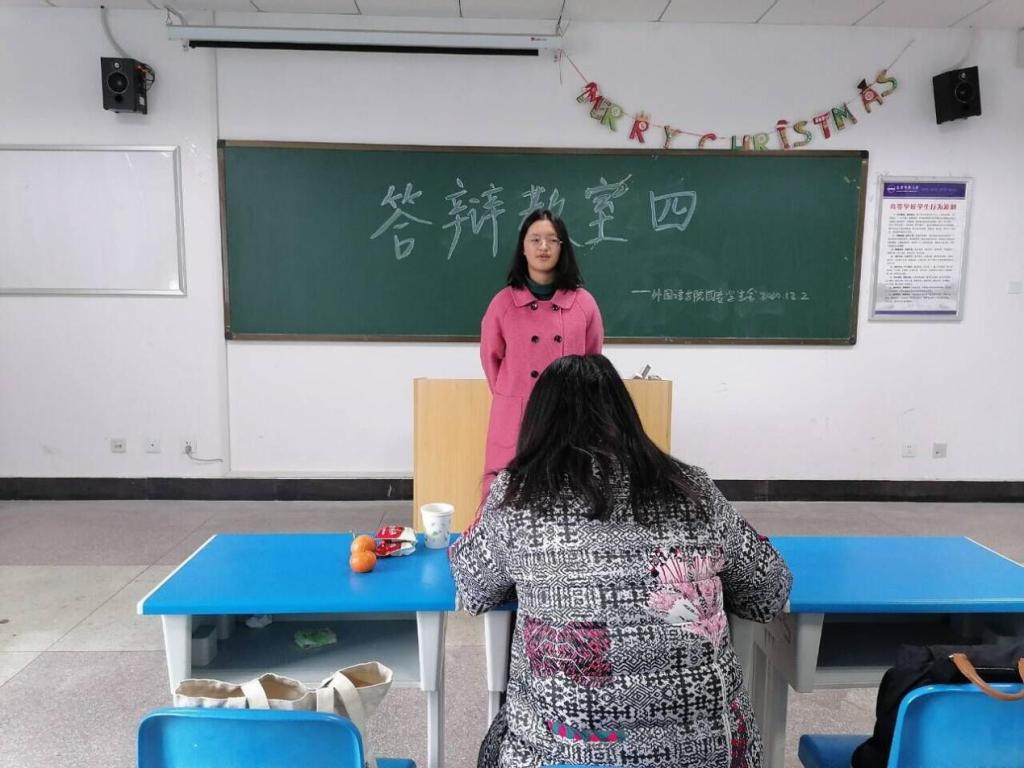 正式答辩开始前,同学们有序地从读书园工作人员处领取《tyc41183太阳成集团学生读书情况验收登记表》,按照顺序依次进场。现场答辩时,答辩同学于10分钟内使用英语或法语向主持老师汇报所读书目,介绍读书笔记的主要内容。随后,评委老师根据各同学的答辩内容提问,同学们一一作答,条理清晰,见解深刻。据悉,答辩选手的成绩将分为A、B、C、D、E五个等级并反馈给辅导员,届时优秀的读书心得也会提供给同学们借鉴。