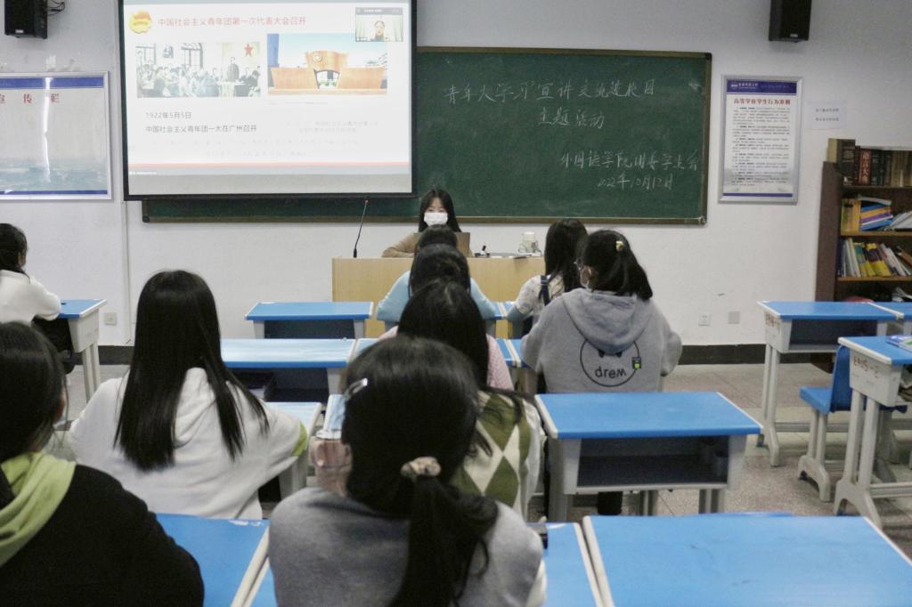 为深入学习贯彻习近平总书记在庆祝中国共青团成立100周年大会上的重要讲话精神,进一步夯实新时代青年坚定不移跟党走的信念和意志,团结引领青年接续奋斗、勇毅前行,10月12日下午,tyc41183太阳成集团组织百余名青年团员于E406分会场参与“青年大学习”宣讲交流进校园活动。