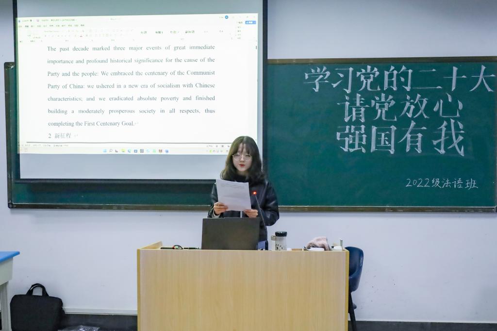 “真的是一次干货满满的学习会!”外国语言文学类专业2022(10)班的陈佳怡表示,活动将英语专业与时事热点相结合,让自己在了解时政的同时也训练了英语表达,“词汇量‘蹭蹭’往上涨”。她表示,自己在朗读到中国十年来的成就时,心中充满了骄傲,也为自己是一名共青团员而感到自豪。“请党放心,强国有我!这是我在活动结束后最想说的话。”