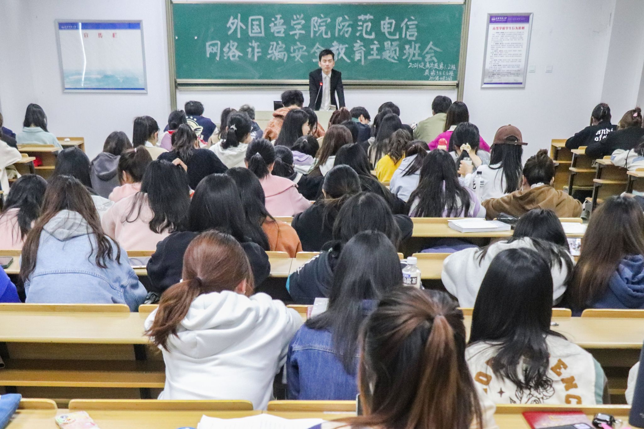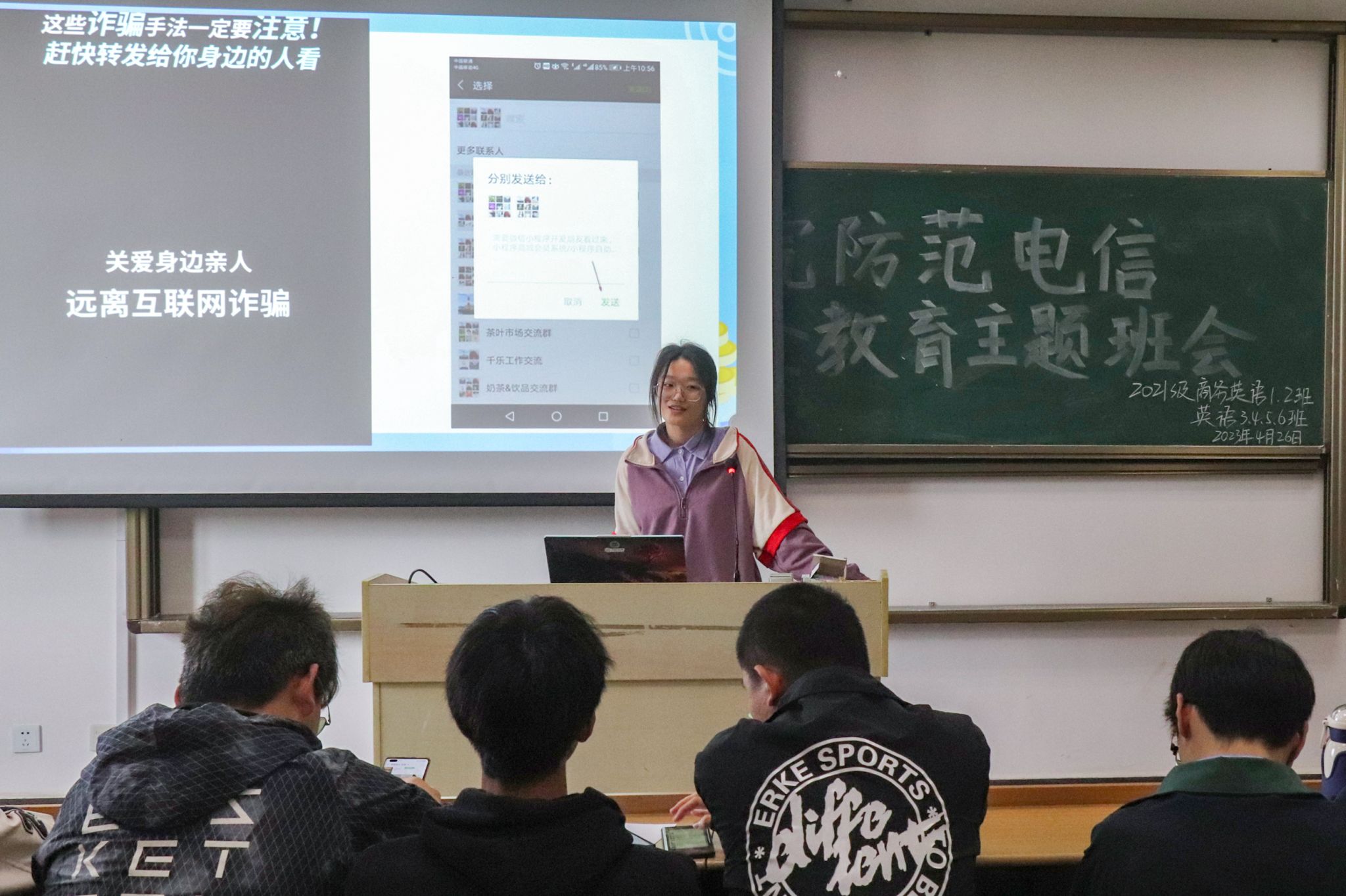4月26日,tyc41183太阳成集团商务英语专业2021(1)班、商务英语专业2021(2)班以及英语专业2021(3)至(6)班在206教室开展联合班会。近200名学生成为班会“主讲人”,用多样化方式宣讲防范电信网络诈骗知识。