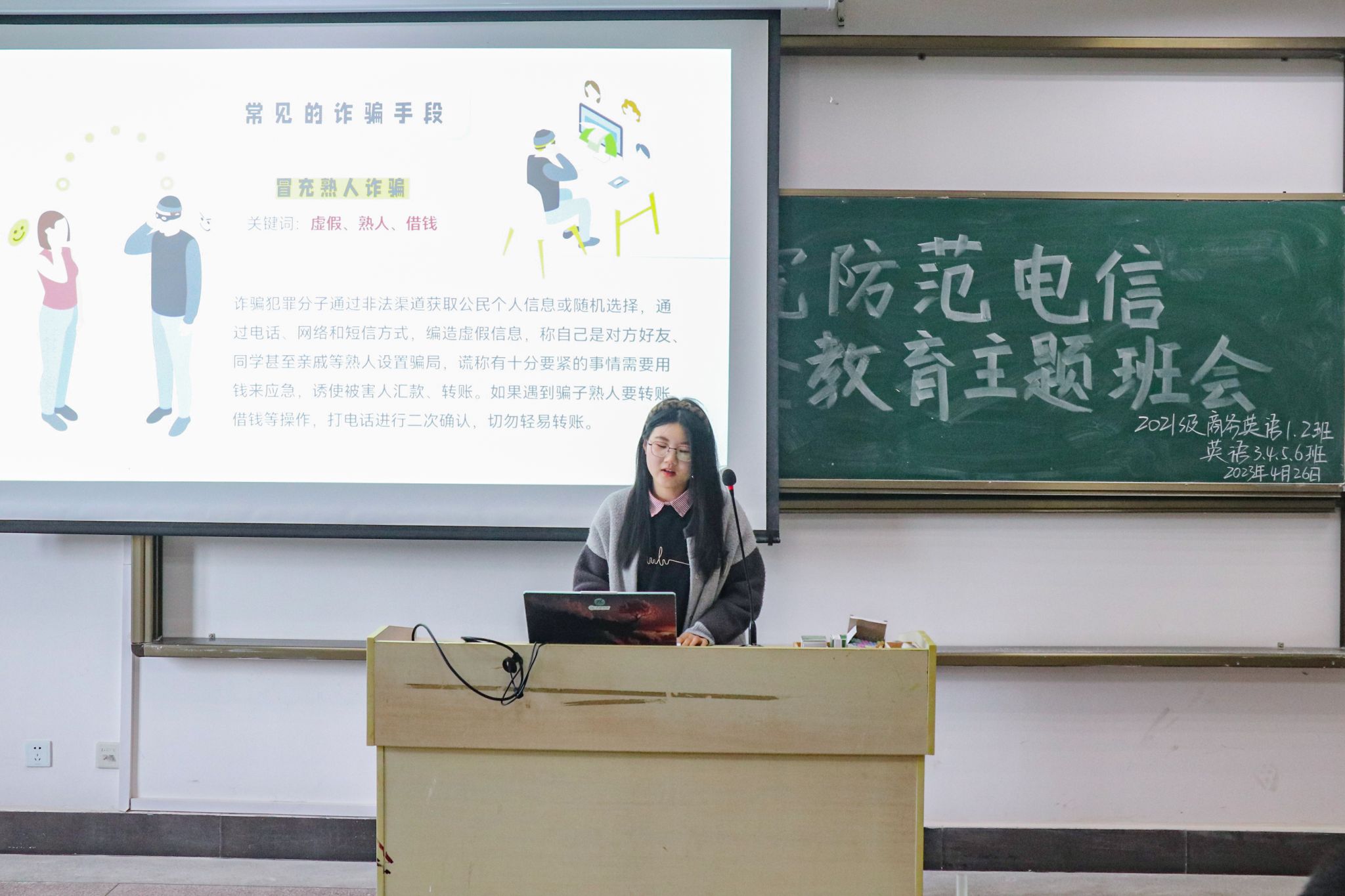 结合具体事例,商务英语专业2021(1)班以身边故事警示学生注意防范网络诈骗;利用谐音梗,英语专业2021(4)班用视频普及防诈骗小技巧;使用PPT,英语专业2021(5)班图文并茂宣讲防诈骗常识。