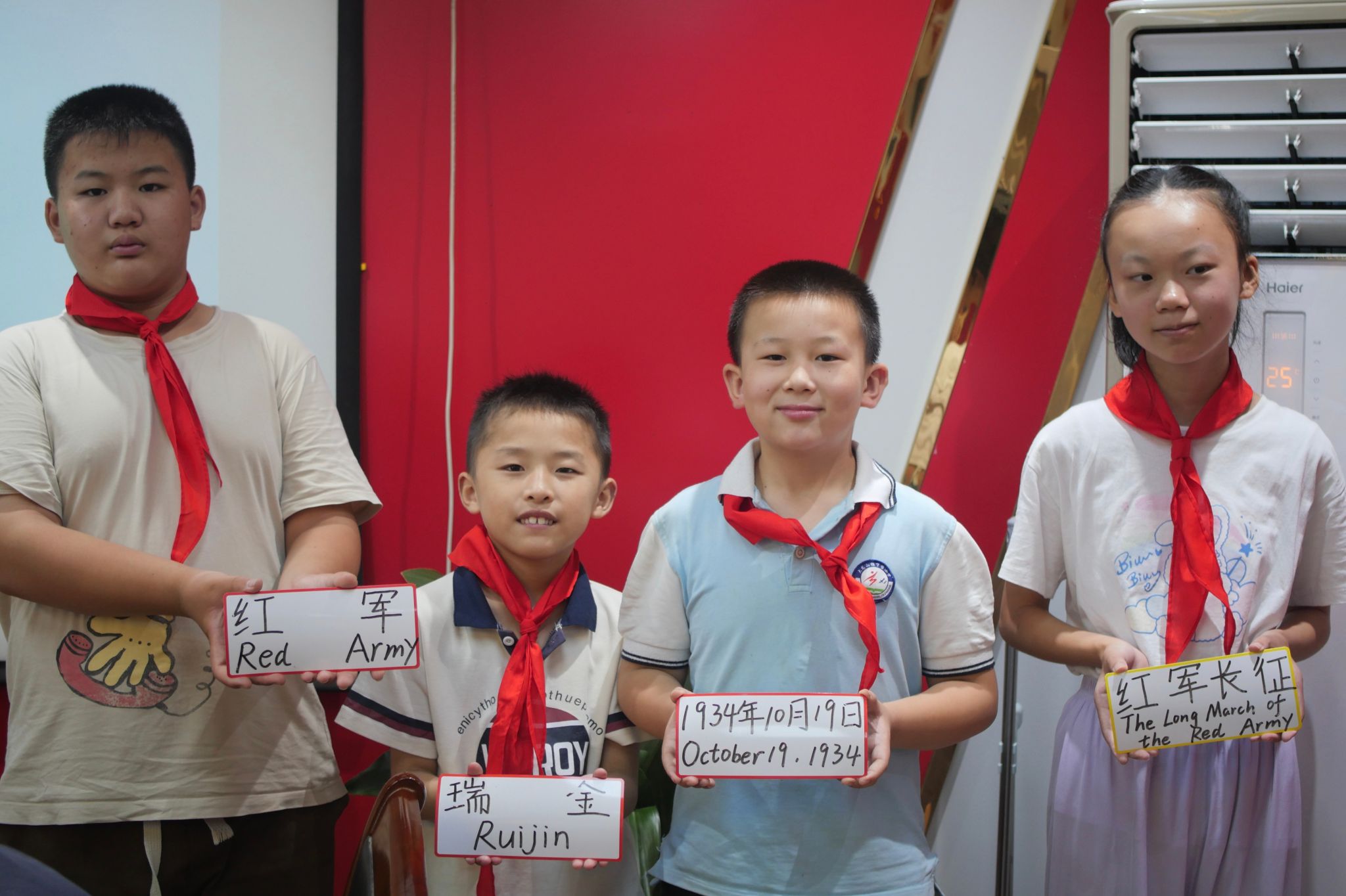 五四运动、新文化运动、红军长征……按照时间、地点、结果等要素,一个个重要事件被细分为四部分,并写在卡纸上。实践团成员鼓励拿到对应卡片的孩子上台,一同拼出“红色记忆”。