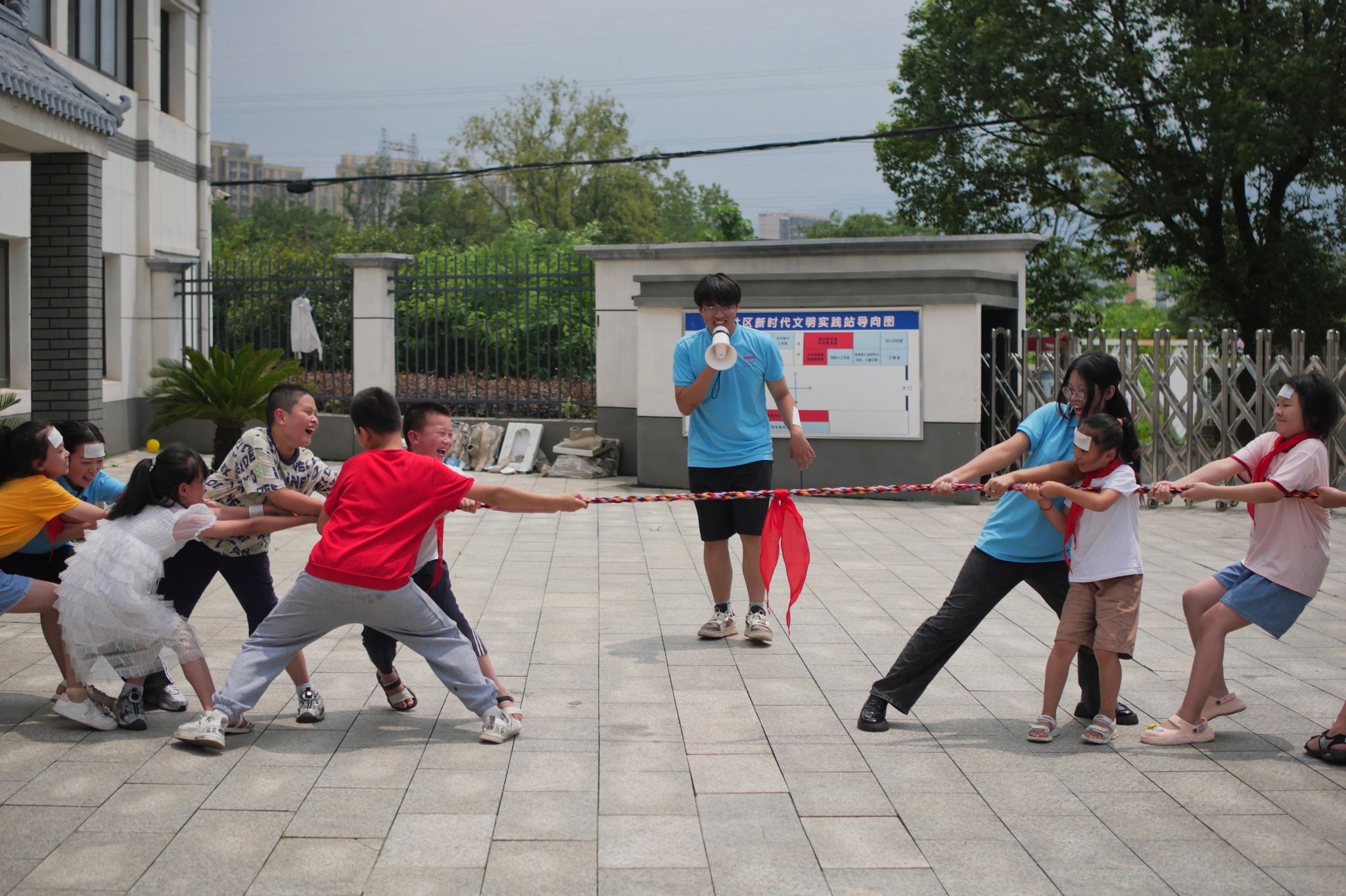 “孩子们都很棒,都很想要获胜。”实践团成员、外国语言文学类专业2022(3)班的樊一景是此次运动会的裁判员,他表示,在最后的拔河比赛中,为增强孩子们与实践团成员之间的情感纽带,他们特地安排了两名成员加入各队进行比拼。“成员和孩子们之间其乐融融,在拔河比赛结束后还相约一起套圈呢。”