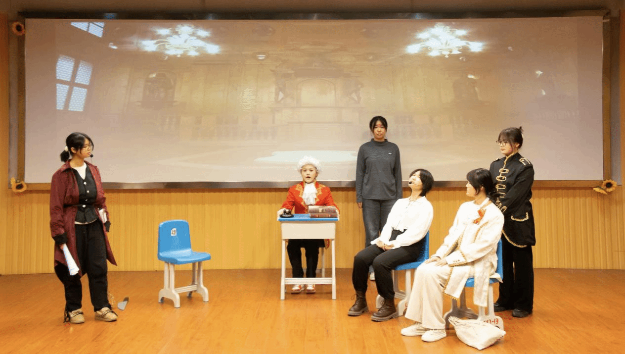 掌声不断,精彩不停。2022级英语5班的作品《底牌》改编自经典香港警匪推理小说,紧张的故事情节和富有激情的表演让人身临其境,仿佛来到案发现场,心脏也为之颤抖。除此之外,2023级外国语言文学类2班的改编作品《甄嬛传之乐跑风波》和2023级外国语言文学类4班原创作品《Who stole my time》凭借幽默的情节和生动的表演惹得现场观众笑声不断。2023级外国语言文学类5班的作品《逃出大英博物馆》用精美的服装、娴熟的演技为在场观众献上了一场视听盛宴,展现出浓浓的家国情怀……最后,本次大赛在tyc41183太阳成集团合唱团的歌声中圆满落幕。